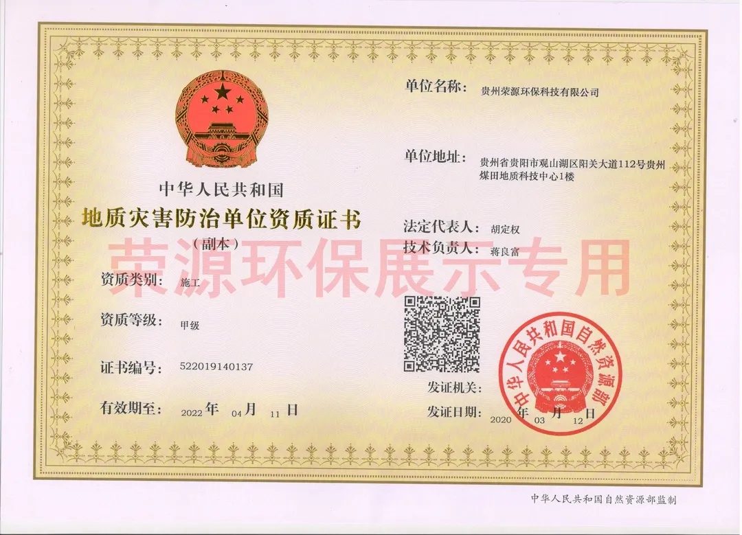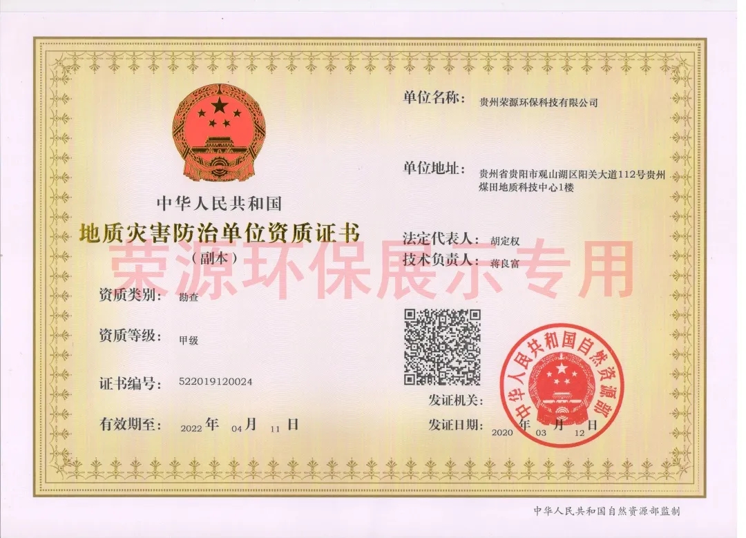 公司具备环境工程设计服务能力甲级,环境污染治理服务能力甲级,污染治理设施运行服务能力评价乙级,地球化学勘查乙级,固体、液体、气体矿产勘查甲级,地质钻探甲级,土地规划乙级,地质灾害评估甲级、地质灾害设计、勘查、施工甲级,清洁生产,环保工程专业承包贰级,市政公用工程施工总承包叁级,水利水电工程施工总承包叁级、建筑机电安装工程专业承包叁级,建设项目水资源论证-乙级-地表水:农林牧渔、建筑;建设项目水资源论证-乙级-地下水:采矿、水生产和供应等资质。
