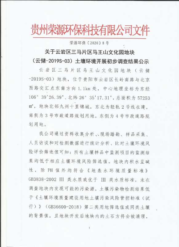 关于云岩区三马片区马王山文化园地块土壤环境开展初步调查结果公示